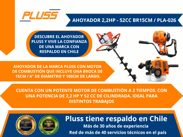 CON ESTE PODEROSO AHOYADOR “PLUSS” DE 52CC Y POTENCIA DE 2,2HP CON UNA BROCA DE 15CM / 6″ DE DIAMETRO POR 100CM DE LARGO, LO PODRAS HACER RÁPIDO Y AUTOMÁTICAMENTE.