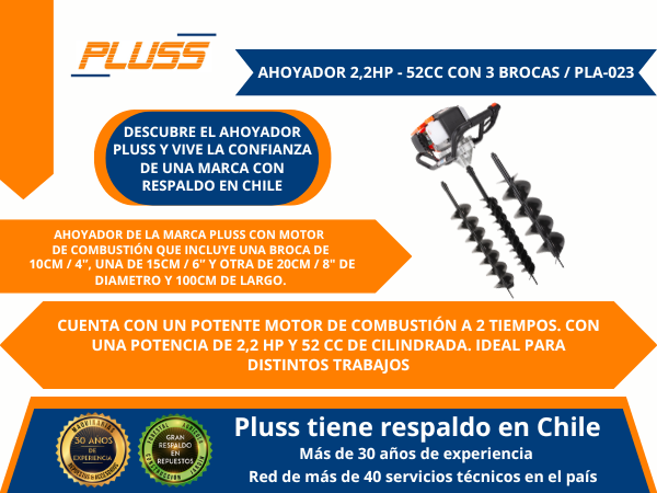 PORQUE “PLUSS” TIENE LA SOLUCIÓN PARA TI Y TU PROYECTO DE CONSTRUCCIÓN, CON NUESTRO PODEROSO AHOYADOR DE MOTOR DE LA MARCA “PLUSS” DE 52CC Y 2,2HP.