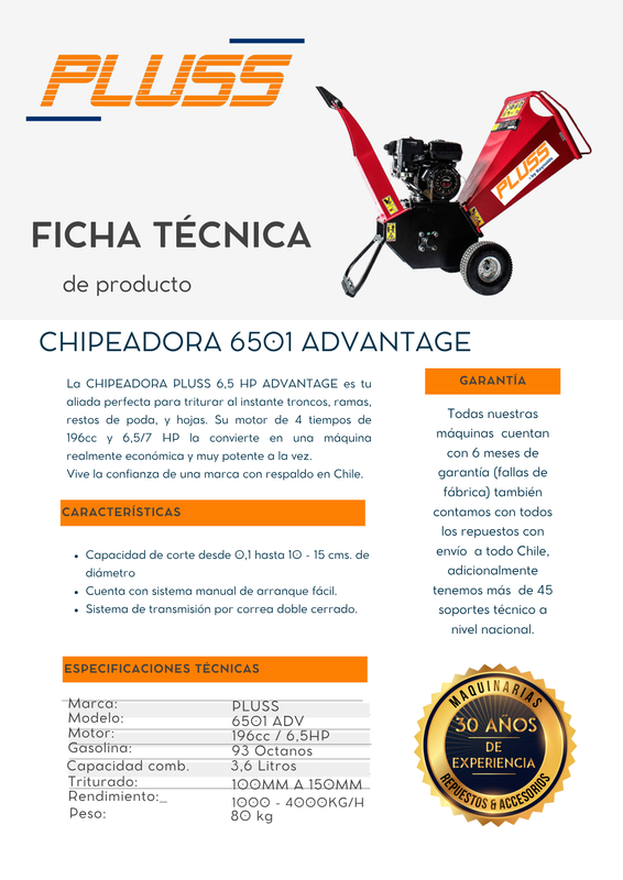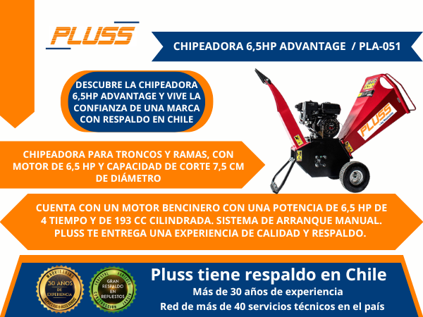 LA NUEVA CHIPEADORA AUTÓNOMA DE DISEÑO COMPACTO “PLUSS” 6501 ADV ES IDEAL PARA TRITURAR AL INSTANTE TRONCOS, RAMAS, RESTOS DE PODA, HOJAS Y OTROS PEQUEÑOS DESECHOS.